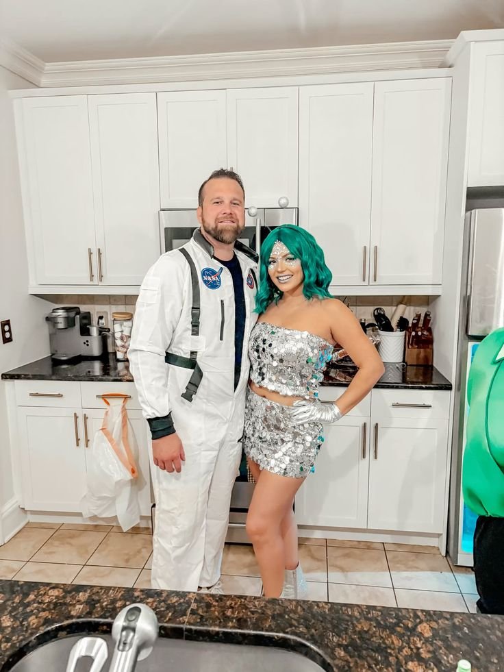 One of you suits up in a classic white space explorer outfit (NASA patches optional), while the other goes full alien mode—think green face paint, metallics, antennas, or even a glow-in-the-dark look. It’s the perfect blend of sci-fi and couple goals.