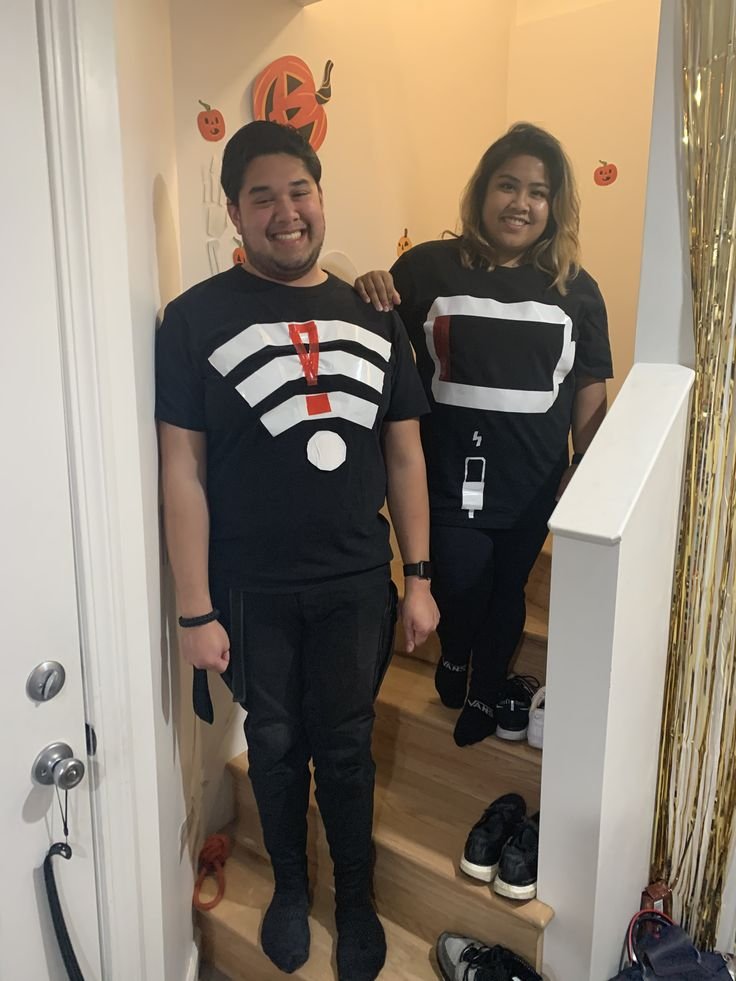 One of you dresses up as a strong WiFi signal—white or black clothes with signal bars made of felt or cardboard. The other goes as a “No Signal” screen—complete with color bars or a big red X.