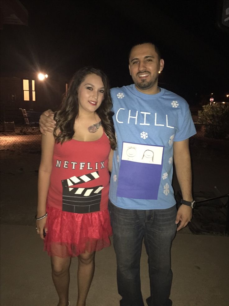 One of you wears a red Netflix logo shirt (or DIY your own with iron-on letters), and the other rocks a “Chill” outfit—think cozy robe, pajamas, fuzzy socks, and a fake remote in hand. It’s low effort, super funny, and everyone will instantly get the reference.