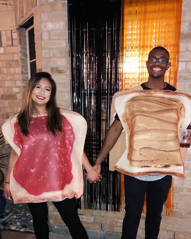 Peanut Butter & Jelly is a classic—and it works because it’s instantly recognizable. Plus, it’s easy to DIY. Create sandwich-shaped costumes out of cardboard or foam board, paint one side peanut butter brown and the other a deep purple or red. Strap it over neutral-colored outfits and you’re done.