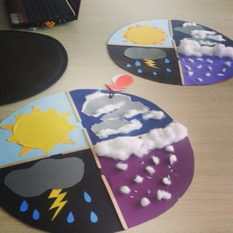 Use two round cutouts: one for the wheel base and one with cutouts or labels for different weather predictions (sunny, cloudy, snowy, shadow, no shadow). Kids can decorate each section and then fasten the top wheel with a brad so it spins.