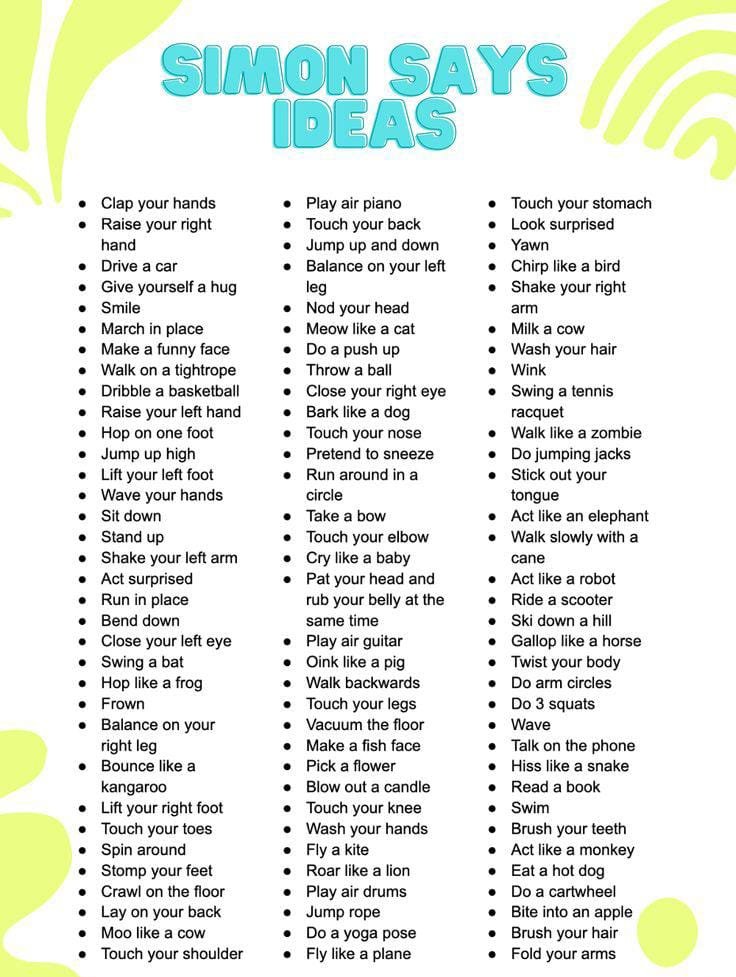 - Simon says touch your nose, then your elbow, then your ear… in reverse! Sequencing challenges keep them on their toes.